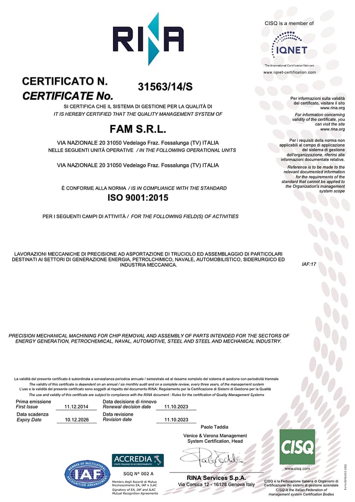 FAM S.r.l. è stata fondata nel 1979 dal Sig. Cecchetto che cominciò delle lavorazioni di tornitura e fresatura manuale all’interno di un vecchio casolare. Nel primo periodo la produzione era concentrata prevalentemente nel settore dell’oleodinamica, con la costruzione di centraline e di pistoni…